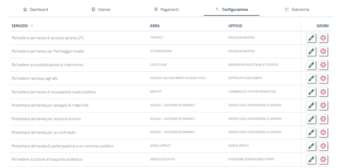 Cliccando su "Configurazione" si accede alla sezione dedicata alla modifica dei testi descrittivi dei singoli servizi che l'utente troverà nel Pannello Utente.