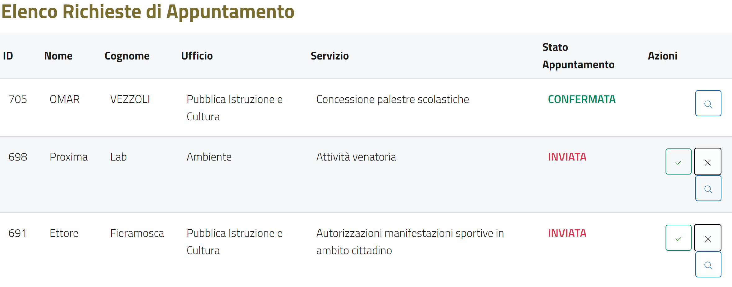 6. STATO APPUNTAMENTO: lo stato in cui si trova la richiesta che può essere INVIATA, ANNULLATA o CONFERMATA