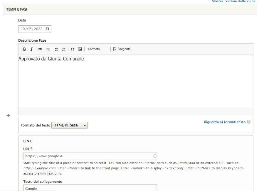 Nel box "Tempi e Fasi" inserire la data o le date di approvazione e/o modifica del regolamento.